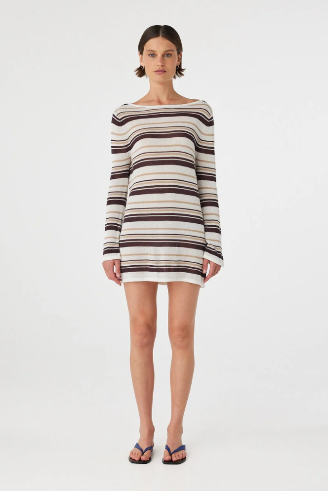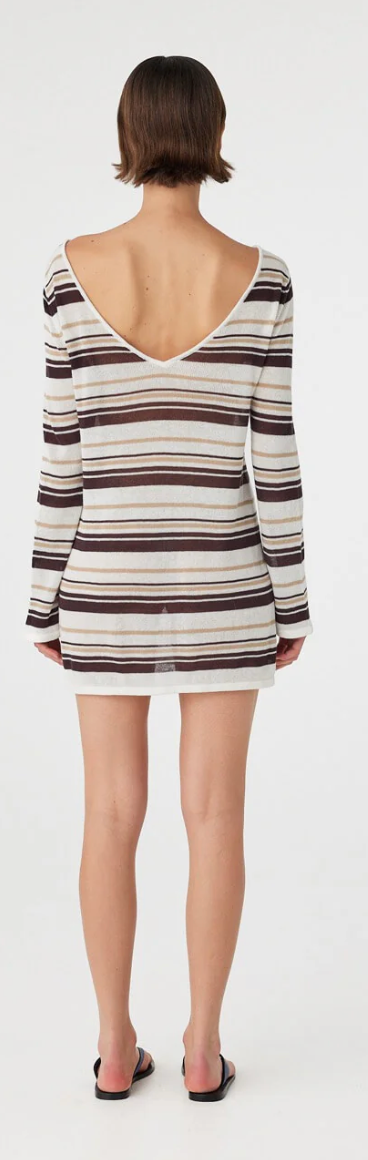 The Nia Long Sleeve Mini Dress in Cream Choc Stripe features a boat neckline and a loose, relaxed fit in a lightweight sheer cotton knit. Designed to layer effortlessly over swim, it’s an elevated beach-to-lunch essential that balances ease and texture.