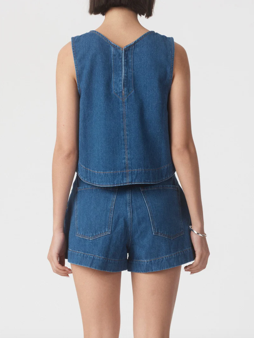 Our timeless denim top. The Gemma Tank is sleeveless with cropped length and curved hem. Featuring v-neck back with button opening. Crafted from premium rigid denim.