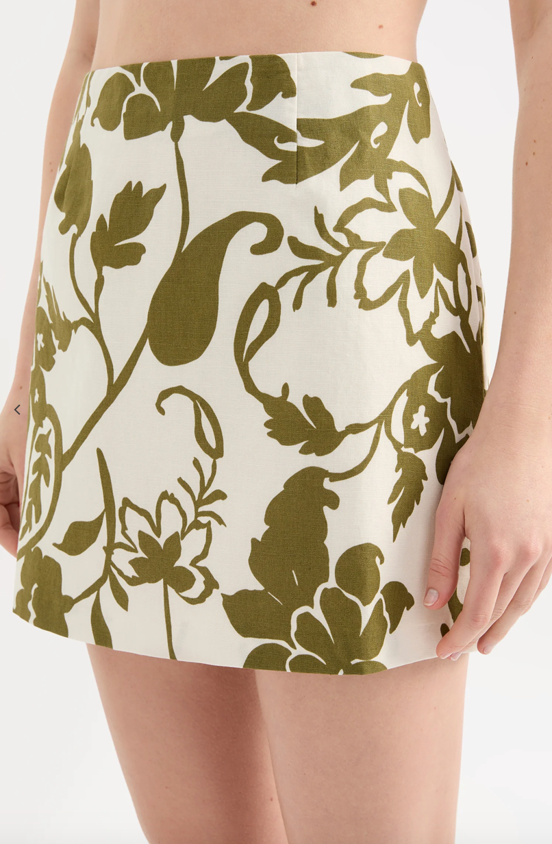 The Dahlia Mini Skirt is made from a linen blend fabrication in our exclusive Dahlia print. The silhouette is high waisted and mini in length. Features include a clean finish waist and invisible zipper. This style is fully lined.