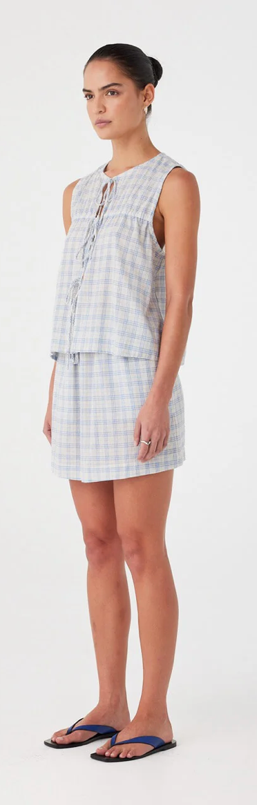 A relaxed cotton blouse with ruched yoke and tie-front closure. Designed in a lightweight check pattern with soft volume and breathable drape for warmer days.