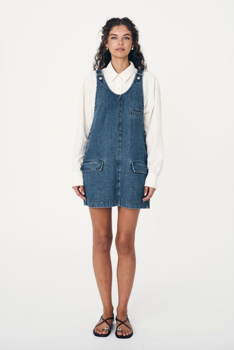 A denim mini with a playful edge. The Franka Dress is cut in a pinafore silhouette with scoop neck, branded hardware and belt pockets - the perfect layer over lace or silk.