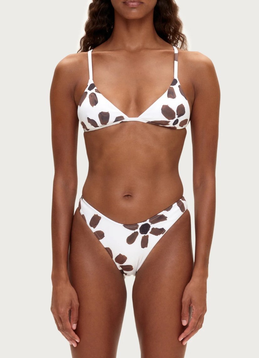 A buttery-soft bikini brief with a flattering curved waistline, featuring a hand-drawn chocolate floral print. Designed to sit high on the hip, it reveals just enough skin while offering a comfortable, covered feel.